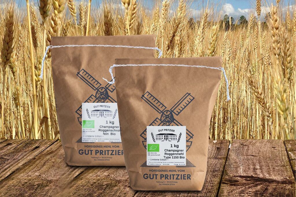 Unseren wertvollen Champagnerroggen bauen wir exklusiv für den Bäckermeister Hannes Behrens aus Plau am See an – bieten ihn aber interessierten Kunden gerne auch in den zwei Qualitäten „Champagnerroggen-Mehl Typ 1150“ sowie „Feines Champagnerroggen-Backschrot“ an.